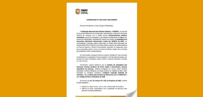 Estão sendo enviadas mensagens propondo que servidores desistam da execução coletiva conduzida pela Federação Nacional dos Policiais Federais (Fenapef) para ingressar com uma nova execução individual, sob a promessa de pagamento mais rápido, valores supostamente maiores e honorários menores.