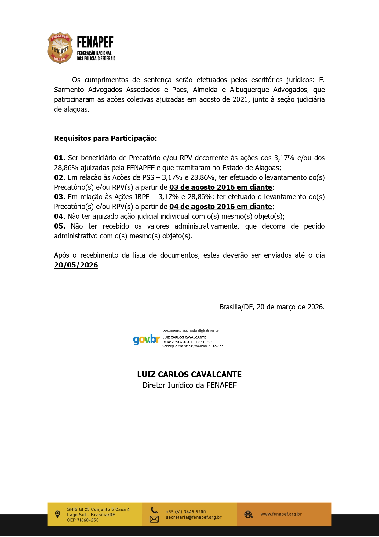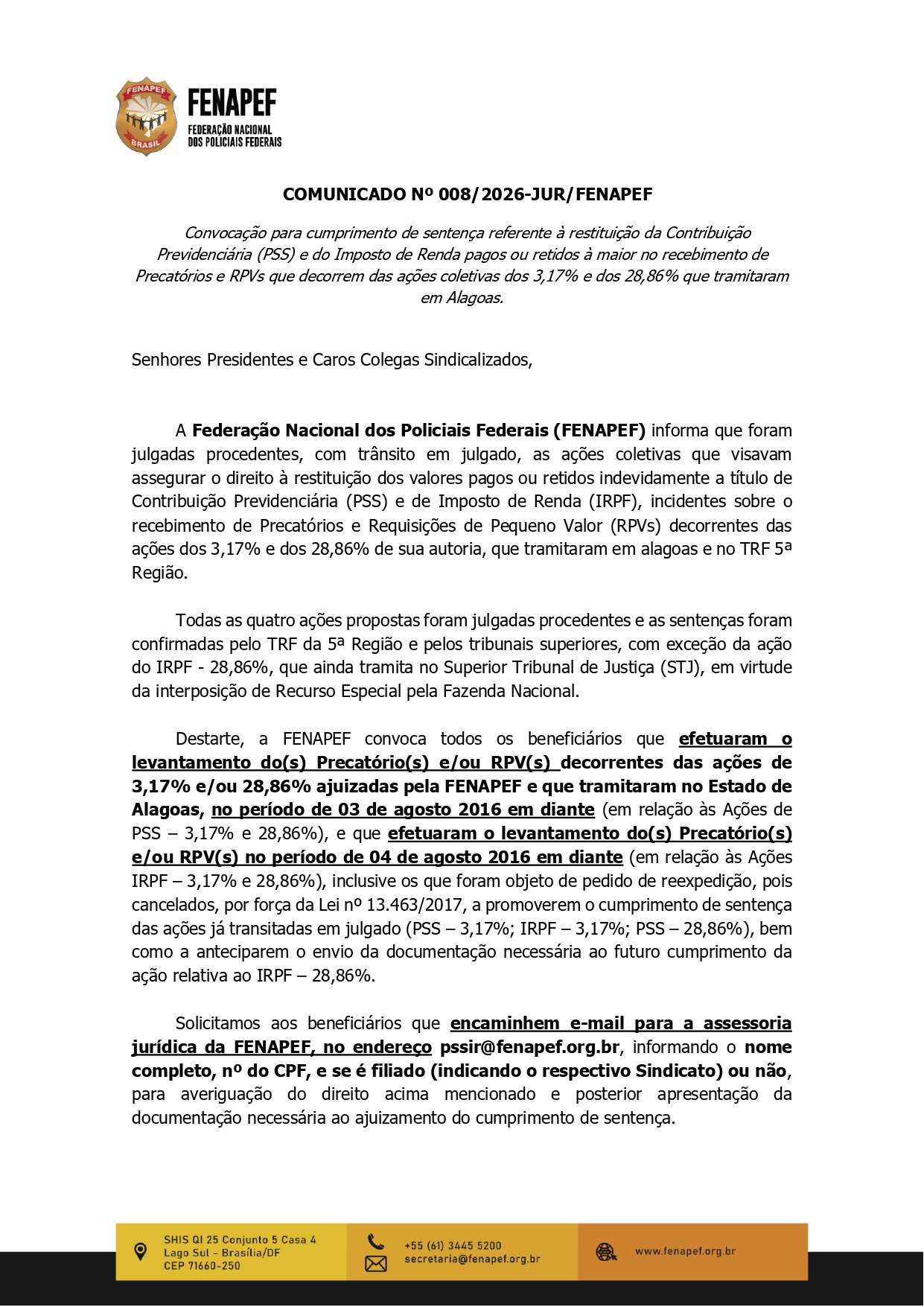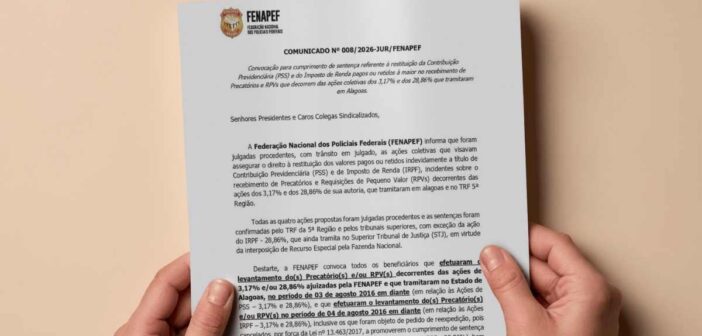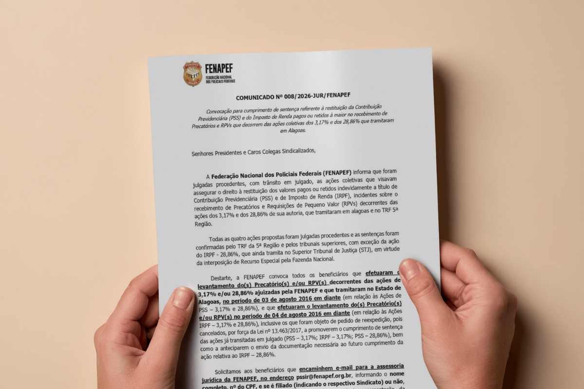 A Federação Nacional dos Policiais Federais (Fenapef) divulgou comunicado importante aos servidores que foram beneficiários de precatórios e RPVs relacionados às ações dos 3,17% e dos 28,86%. A medida trata do cumprimento de sentença para restituição de valores pagos ou retidos indevidamente a título de contribuição previdenciária (PSS) e Imposto de Renda.